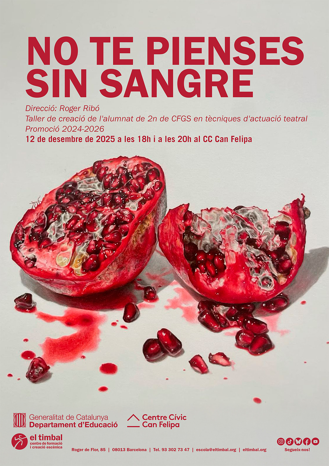 No te pienses sin sangre, el taller de creación del alumnado de 2º de estudios profesionales, se presenta el jueves 12 de diciembre de 2025, a las 18:00h y a las 20:00h en el CC Can Felipa.